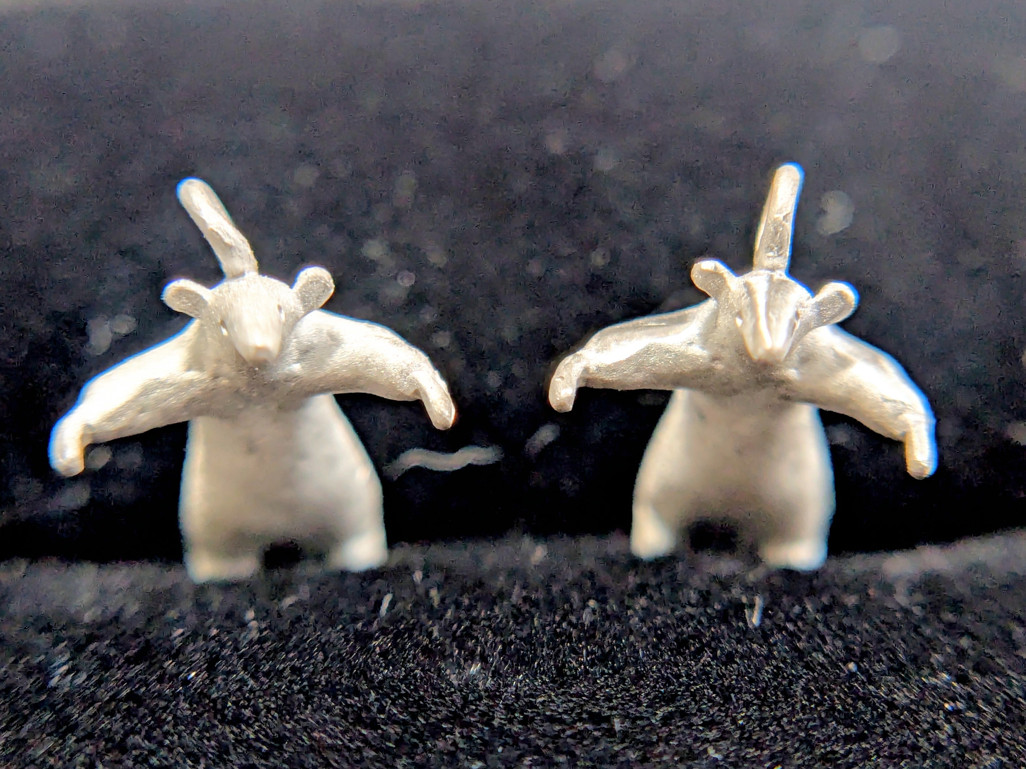 黒いベストを着ているような模様と、大きく発達した前肢第3指のカギ爪が特徴です。(危険なため、指は省略して爪も丸めていますが、前肢の指は4本、後肢の指は5本です)